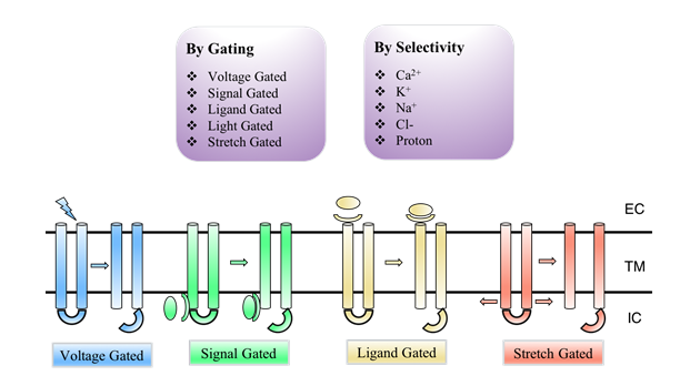 Ion channel have been identified into various types by gating mechanism or ion selectivity.