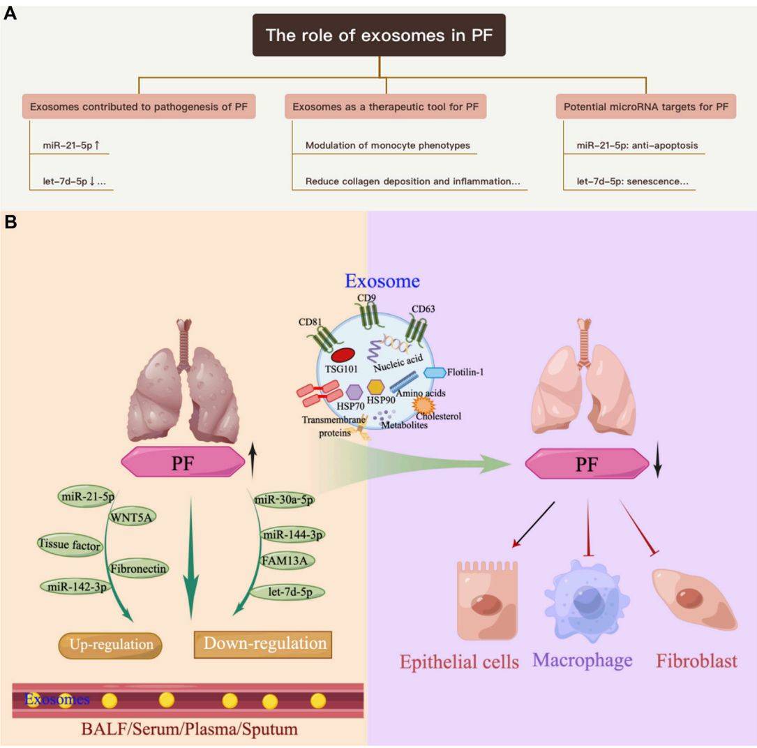 The exact pathogenesis of PF is unclear and there is a lack of effective treatments, with a poor prognosis and a median survival of only 3-5 years from diagnosis. Although two therapeutic agents (pirfenidone and nintedanib) can slow the rate of lung function decline, they are not curative and have significant gastrointestinal side effects. Lung transplantation, as a radical treatment, improves patient survival, but challenges such as donor organ shortage, immune rejection, and surgical complications remain. Therefore, PF requires more efficient biomarkers and therapeutic modalities to improve early diagnosis and treatment outcomes for patients. Exosomes are critical for intercellular communication, immune response, immunomodulation, inflammation, and cellular phenotypic transformation and play an important role in PF. In addition, the number and characteristics of exosomes change according to the pathophysiological state of the disease, and therefore exosomes can be used as biomarkers for monitoring the disease.