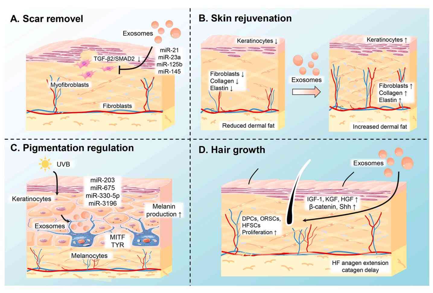 Exosomes play a crucial role in skin repair, including promoting blood clotting, reducing inflammation, accelerating tissue remodeling, and inhibiting scar formation. Studies have found that onion exosomes have anti-inflammatory and antioxidant effects. It can prevent skin scarring. Mesenchymal stem cell exosomes (MSCs-EXOs) encapsulated miRNAs regulate macrophage M2 polarization and reduce the expression of inflammatory factors, thus controlling the inflammatory response.