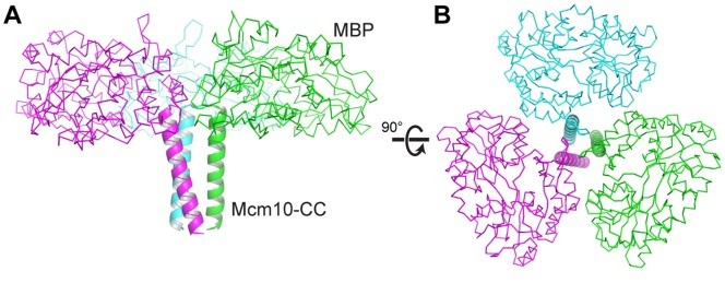 Figure 1. Crystal structure of the MBP-CC asymmetric unit, with each protomer colored differently. Maltose-binding protein is shown as a Cα-trace, and the xMcm10 coiled-coil is depicted as a cartoon ribbon. (Du W, et al., 2013).