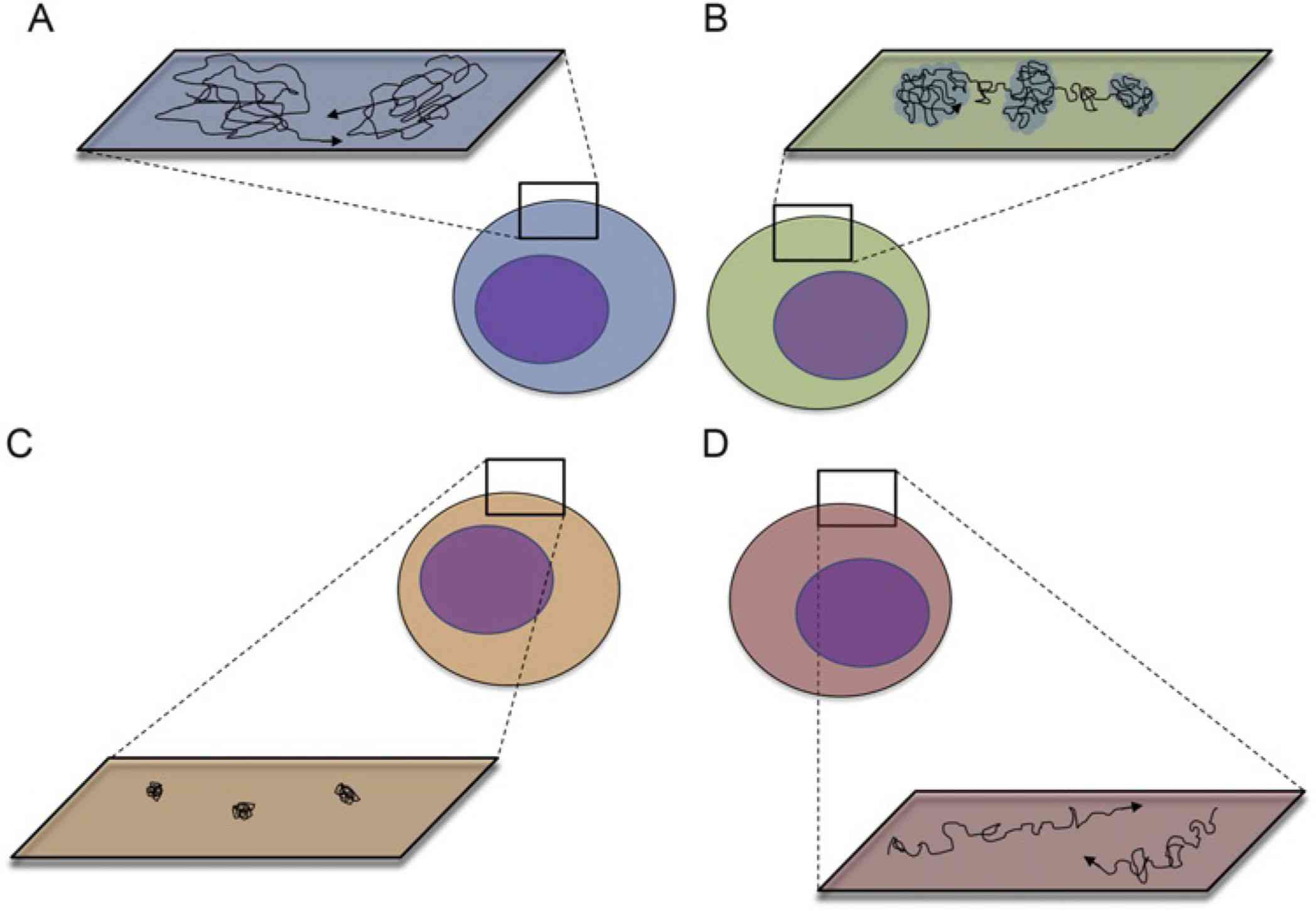 Figure 1. Major modes of membrane protein mobility (A-D): Random Diffusion, Confinement, Restriction, and Directed Motion. (Alenghat F J, et al., 2013)