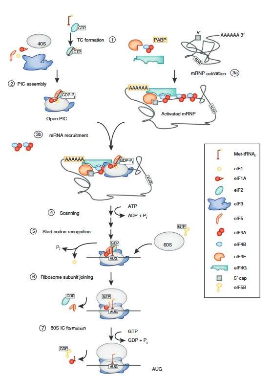 Figure 3. Schematic of the translation initiation pathway in eukaryotes. Initiation begins with the formation of the ternary complex (TC) containing eIF2-GTP and the initiator tRNA (1). The ternary complex is recruited to the 40S subunit with the help of eIFs 1, 1A, 3 and 5 to form the PIC (2). Meanwhile, the mRNA is bound by the eIF4 factors and the PABP to form an activated mRNP (3a), which is then recruited to the PIC (3b). Once bound at the 5′ end of the mRNA, the PIC scans to locate the start (AUG) codon (4). Start codon recognition triggers eIF1 release and conversion of eIF2 to its GDP-bound state, arresting the scanning process (5). eIF2-GDP and eIF5 dissociate, clearing the way for eIF5B to mediate joining of the 60S subunit (6). Subunit joining is followed by GTP hydrolysis by eIF5B and factor dissociation to form the 80S initiation complex (IC) (7). (Aitken and Lorsch, 2012)