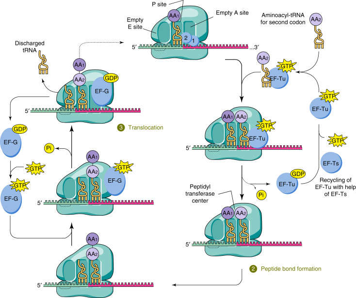- Elongation: After the 70S complex has assembled with the initiator tRNA at the P site, the ribosome begins to scan the mRNA sequence. Each codon corresponds to a specific amino acid that is delivered to the ribosome by the elongation factor thermally unstable (EF-Tu). EF-Tu forms a complex with a charged tRNA molecule, places it on the mRNA, and then dissociates from 70S by GTP hydrolysis.