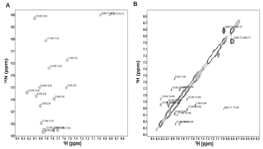 Figure 7. (A) Expansion of the 1H-15N-HMQC and (B) NH-NH correlations contour map of 5.0 mM Stigmurin in TFE-d2:H2O (40:60, v:v), 298 K. (Daniele-Silva et al., 2020)