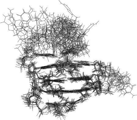 Figure 2. An ensemble of 10 structures from an NMR determination, of a DNA quadruplex formed by a sequence found in the human bcl2 promoter (PDB entry no. 2F8U). Note the close correspondence of the bases in the various structures, contrasting with the diversity of conformation and flexibility shown by the extrahelical groups. (Neidle, 2008)
