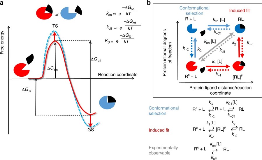 Figure 3. Models of drug–target binding. a Schematic diagram of a one-barrier drug–target binding free energy profile. b Diagram schematically illustrating different mechanisms of drug binding involving protein conformational changes. (Amaral et al., 2017)