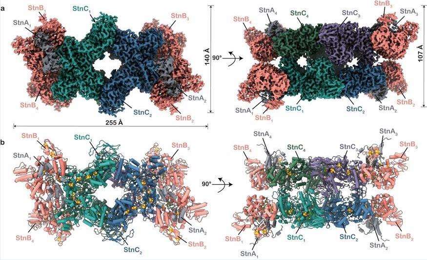 StnABC acts as an electron-divergent transhydrogenase to catalyze reduction-dependent reactions. The researchers revealed the molecular structure of StnABC from S. ovata and observed that the complex consists of four protomers, each a StnABC heterotrimer. The tetrameric core consists of the StnC subunit of each protomer flanked by the more energetic StnAB subcomplexes, with only StnB binding to StnC, whereas StnA is found to interact with StnB through multiple contacts. The entire complex contains a large number of redox cofactors, and it is evident from the structure that the distances from all the iron-sulfur clusters to the sides of a single proto membrane ensure rapid electron transfer throughout the structure.