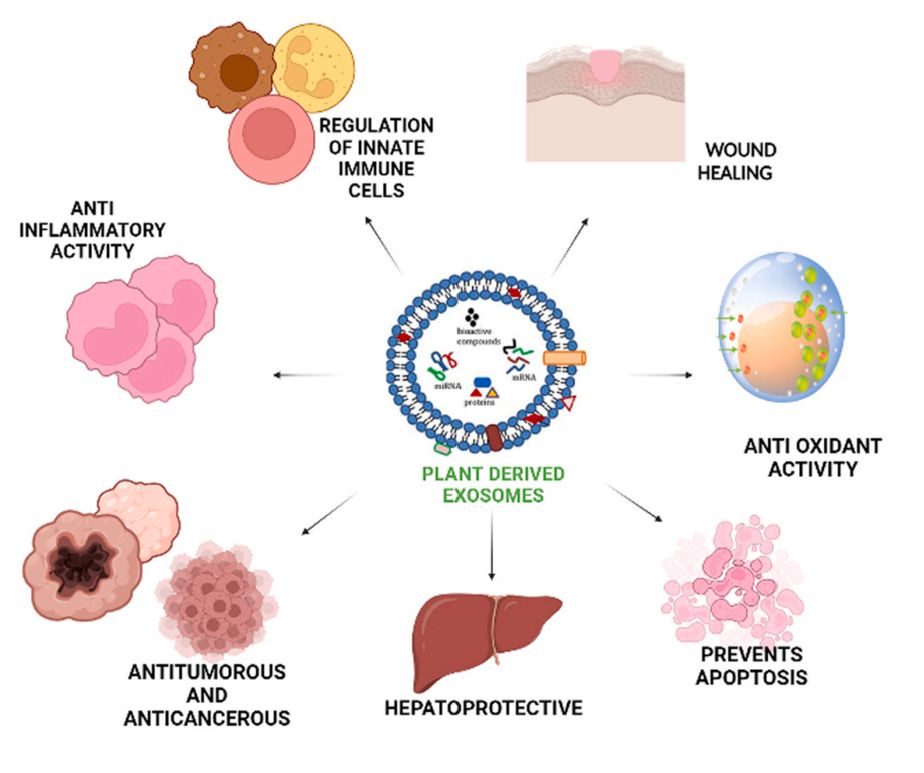 - Plant-derived exosomes carry proteins, lipids, RNA, and a large number of active substances, which have significant regulatory effects in regenerative medicine, immunomodulation, anti-inflammation, and anti-tumor.
